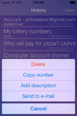 Easy to generate - easy to save. History log is available for passwords and numbers you dont want to forget. Moreover you are able to send them to an email.