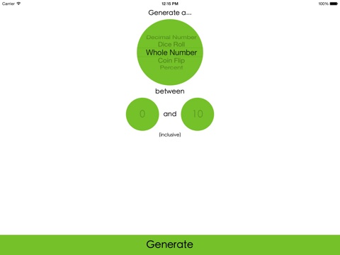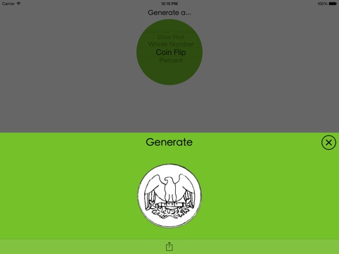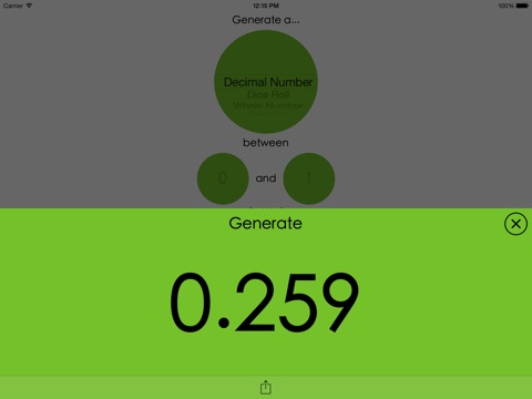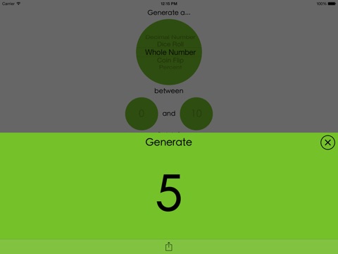 It can generate whole and decimal numbers within a defined range, coin flips, dice rolls, and percents. It also allows you to easily share, copy, or open numbers in another app.