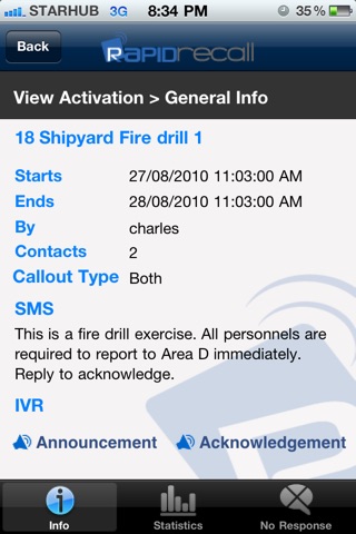 RapidRecall is an emergency notification solution to perform automated call tree. It will delivery the messages via SMS and voice. It will also track acknowledgments and provide graphical reports. You need to have user account and password to login. For more info, visit http://www.rapidrecall.net