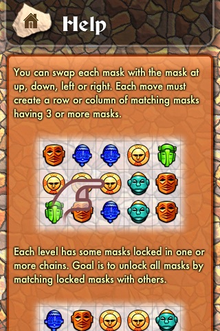 To play, swap the masks to create a 3 match, then match with locked masks to unlock them.