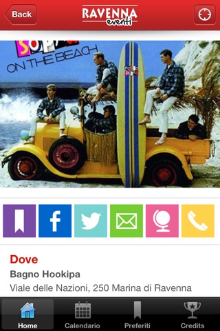 Gli eventi si possono cercare per categoria (pub/bar/disco, mare, sport, musica, cinema, cibo, teatro, arte e cultura, convegni e meeting), per data