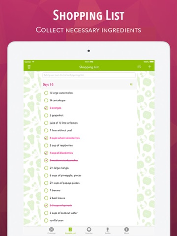 Ive just started the 30-day Smoothie Challenge and am excited about it. I made the alkalizing breakfast smoothie set for day one and the ingredients made so much smoothie I had to give some to my husband and feeeze the rest. Purchasing ingredients for the smoothies can get expensive, especially when looking for fresh organic ingredients. I do recommend trying to substitute with some frozen fruits if possible to offset costs. Since I live in the north eastern US, I also need to buy frozen fruit once the weather turns. However, the app is great! The interface is easy to use and has no complicated instructions. I *love* the shopping list and daily reminder. And, the design makes it feel fresh and inviting, just like Ravana!