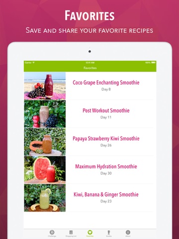 This is a great way to increase your intake of fruits and vegetables. A few things that would make this app perfect: When I paused the challenge, the notifications didnt pause. I wish there would be whole fruit measurements along with the equivalent in cups diced. Day 27 and Day 23 are pretty much the same smoothie, but the photo on day 27 has citrus but the recipe does not. There are a few typos throughout. I really enjoyed this challenge and I would recommend this app to anyone. I did end up splitting the smoothie into two meals/snacks throughout the day because some of them are high in calories.