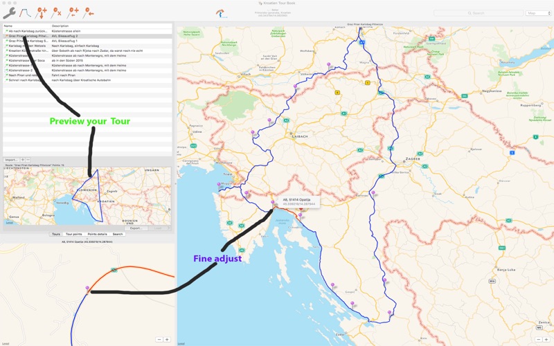 Endlich ein Programm mit dem man am Mac Routen planen kann. Es ist zwar kein Routenplaner im üblichen Sinn, man muss sich die Routen zusammenklicken, aber ein Anfang ist gemacht. Das Programm hat noch viel Potenzial. Weiter so...