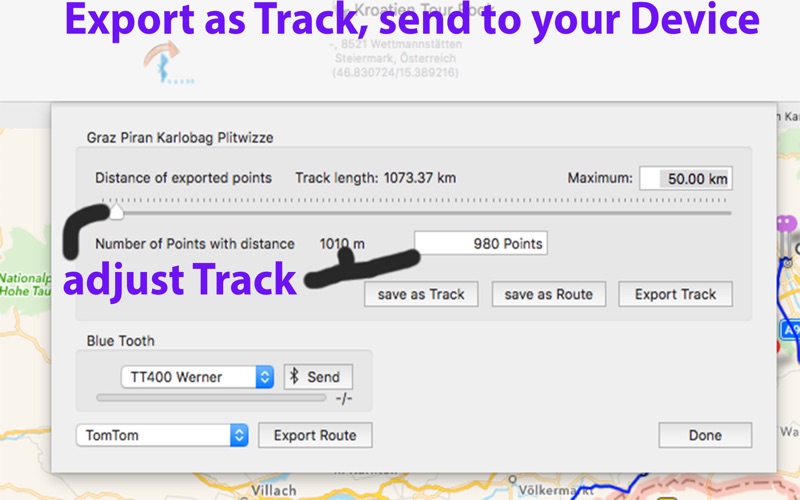 Das zusammenklicken der Tour funktioniert wie beschrieben. Aber leider ist es unmöglich in nützliche Formate zu exportieren. Unter „Preferences“ fehlt der Button für den Export / Import, unter dem man angeblich das Tool GPSBabel-Kommandozeilen-Tool einbinden kann. 2,99 Euro für nichts ...