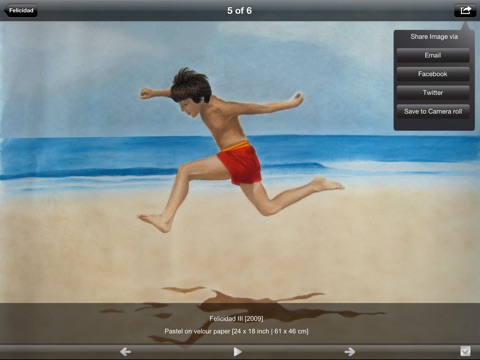 This App is available for iPod, iPhone and iPad. Optimized for iOS6, retina display and iPhone 5. It allows you to share images via email, Twitter and Facebook, or save them to your camera roll. Share the artist bio via email. Select your favorites. View the images one by one, or enjoy a slideshow.