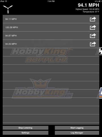 With RCSpeedo the process is greatly simplified: just bring your phone to the field and hit "listen". As you make passes with your favorite airplane, the app will report your speeds back to you in real time!