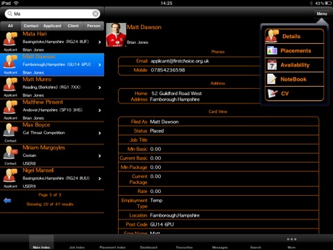 • Quickly get in touch with clients and candidates via SMS, email or phone