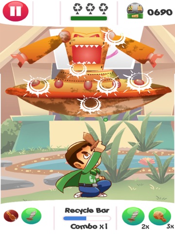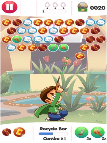 Help Atan collect falling recyclables from the sky or pop trash bubbles before they touch the ground!