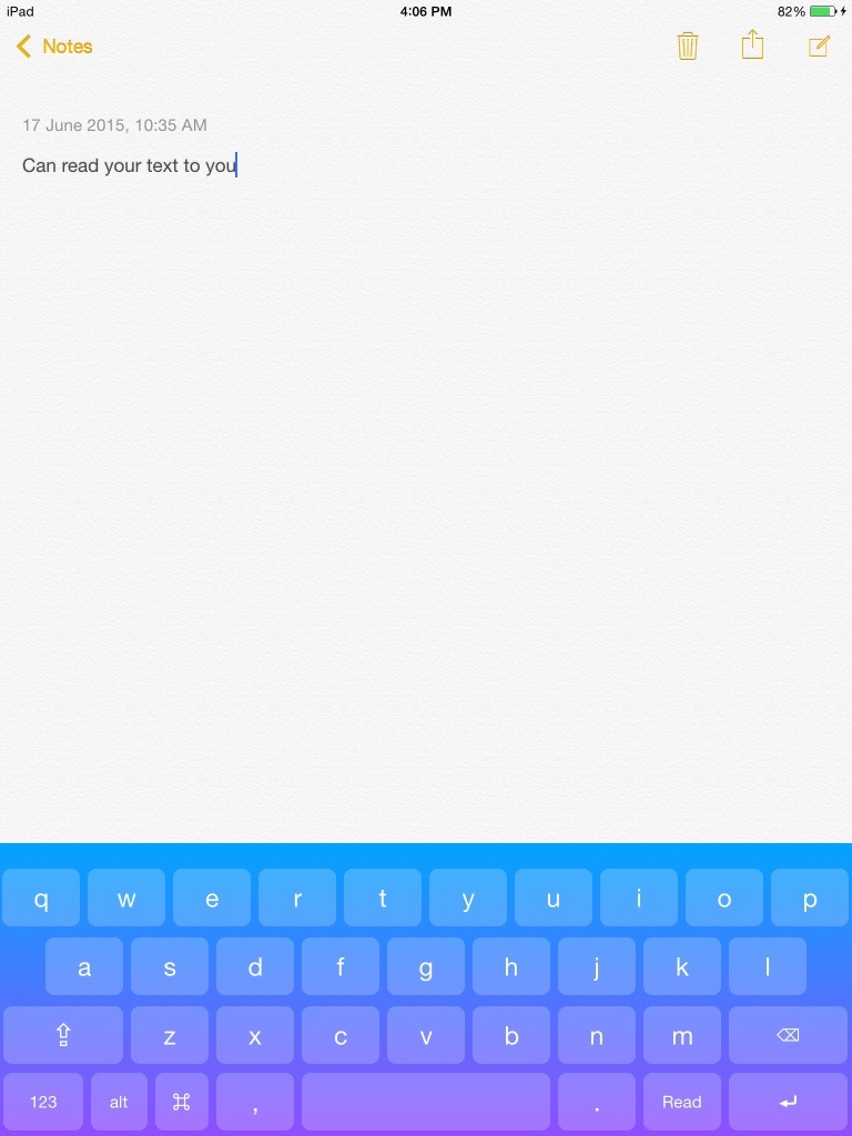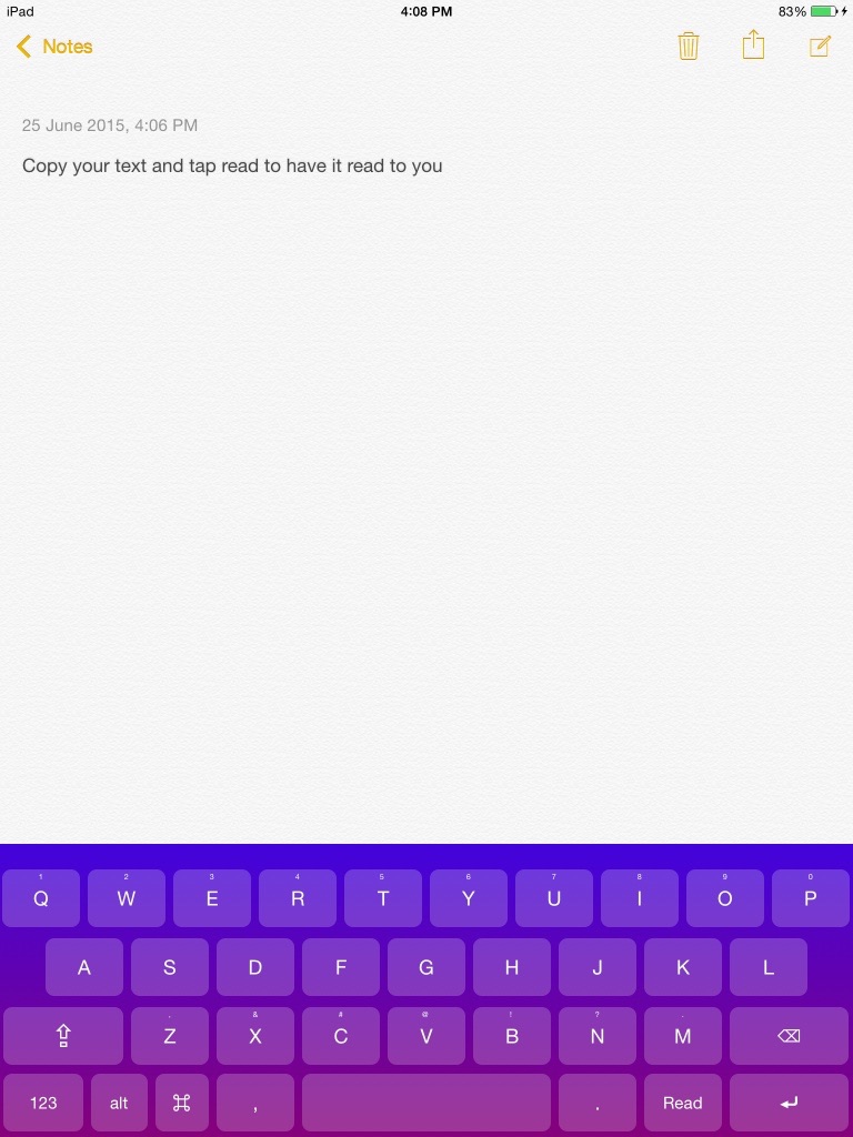 Read To Me Keyboard Works in all apps. Its really amazing. Experience it Now. The Read feature has to be unlocked through an In-App Purchase.