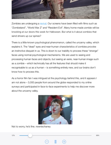 Not possible anymore to read Instapaper / Pocket ? Very Important! ePub would ne nice ! ... soweit ich es probiert habe, ist auch Face detection tauglich. Praktisch, ich neige das iPhone ein ganz klein wenig und Auto scroll stoppt bis ich es wieder zurück neige. Wichtig für mich : Meine abonierten "Google Reader" und "Read it later" Texte als lesefreundlichen formatierten Text lesen zu können + zusätzlichen Auto scroll. Gibt es alles schon ( Good Reader,read it later etc. ) , aber nicht in einer App vereint. Genial