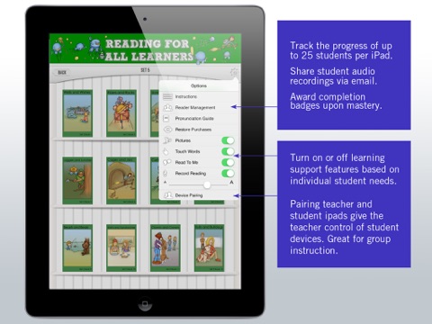 Reading For All Learners is Flexible: Use the program for one-on-one, small-group, large-group, instructor-led, or independent practice settings. The Reading For All Learners iPad edition is fully compatible with the print edition of Reading For All Learners. The print edition, available at www.iseesam.com, is a great companion to the app and can be used to support home-school partnerships.