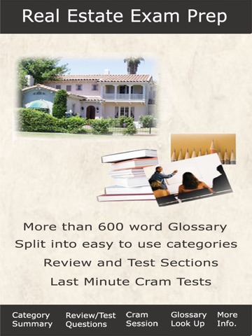 Cram session sets up the most important test related points and gives them to you in a timed test form. Perfect for those time you only have a few minutes and want to be your best.The Glossary is an alphabetical dictionary of real estate terms.