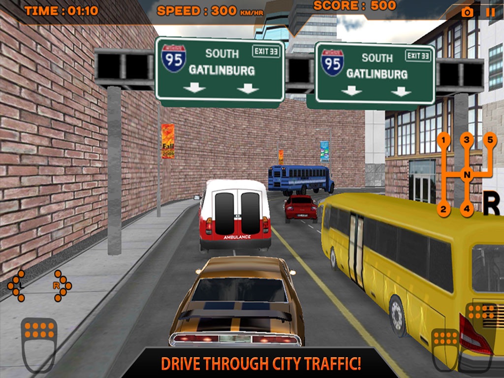On screen indicators , gas and brake pedal for real life driving experience.