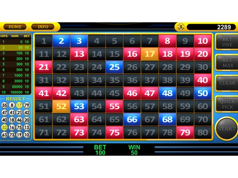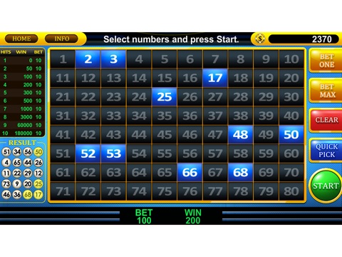 The player is given a ticket with 80 numbers on it. He picks 1 to 15 numbers on the ticket. 20 winning numbers are selected randomly. The more of the players picks that are selected, the bigger the payout.