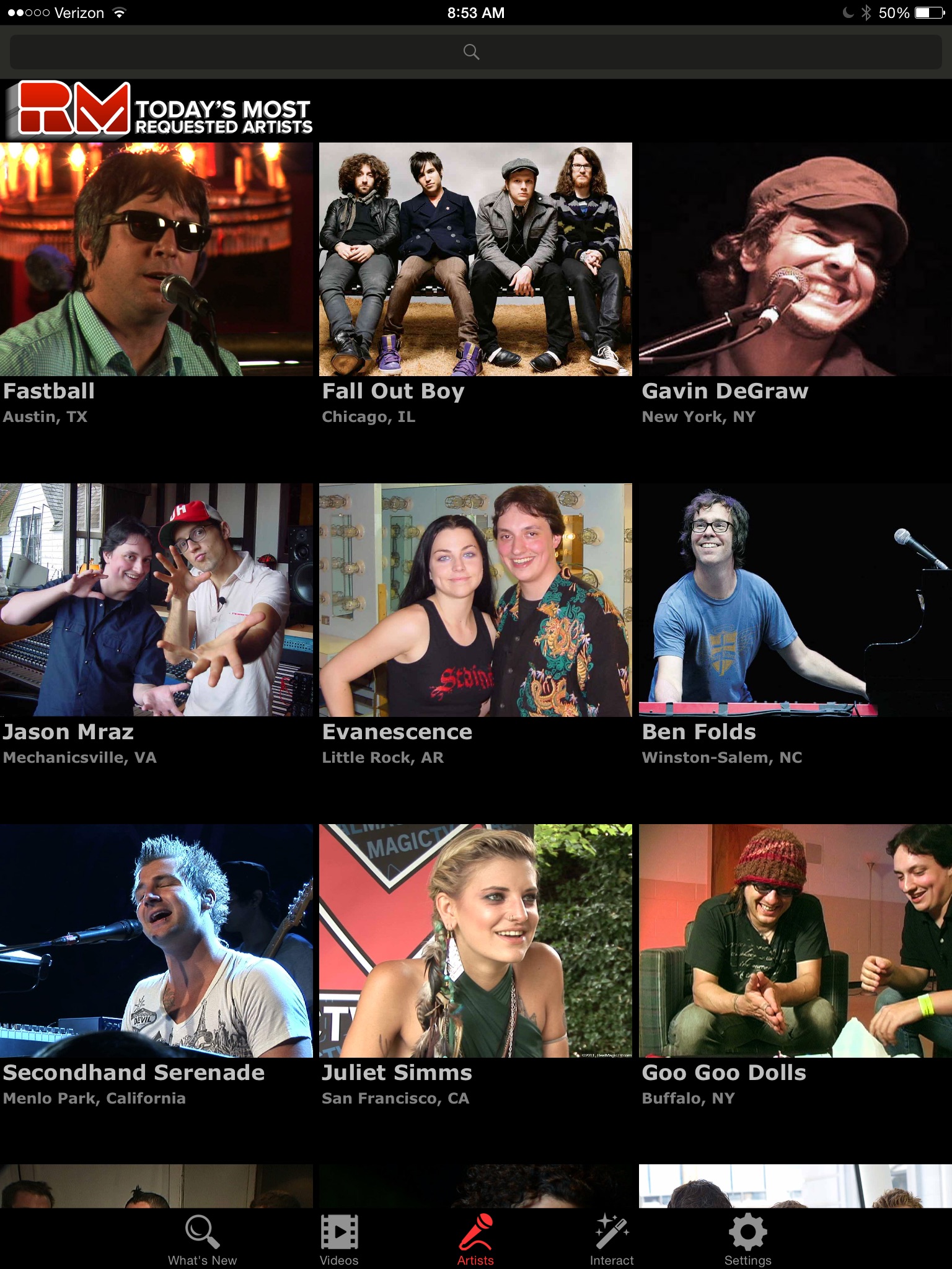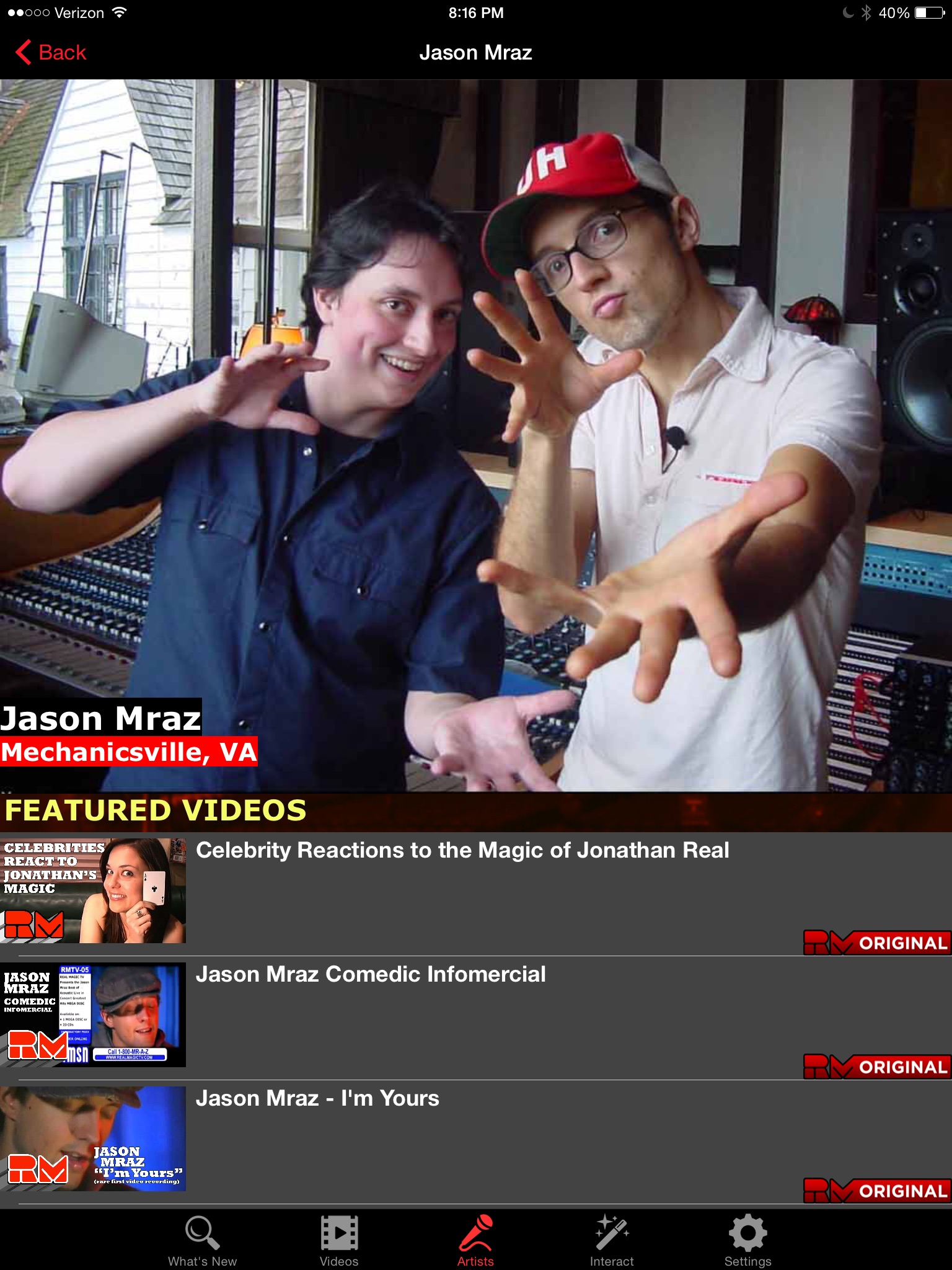 Artists profiles, featured videos, tour dates, social media and streaming music. Each week Real Magic TV features a new artist on the app. Users can learn about the artists, listen to full songs, watch interviews, magic and live performance videos, and share the profiles via email, messaging and social media.