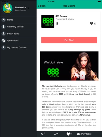 Beautiful Review app of Real Money Casino Online Gambling, where beginners and expert with this app can find a safe Real Money Casinos, Online Sportsbook, best Real Money slots, daily bonuses and much more.