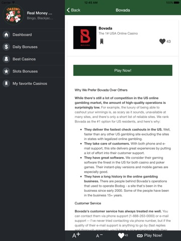 Beautiful Review app of Real Money Online Gambling, where beginners and expert with this app can find a safe Real Money Casino, Online Sportsbook, best Real Money slots, daily bonuses and much more.
