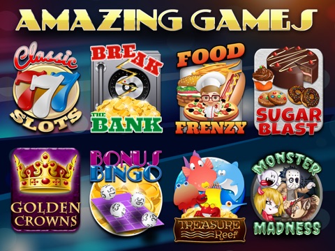 - 14 games including Classic Slots, Food Frenzy, Diamonds, Sports Challenge, Animal Friends, Break the Bank, Sugar Rush, Treasure Reef, Monster Madness and more games coming soon!