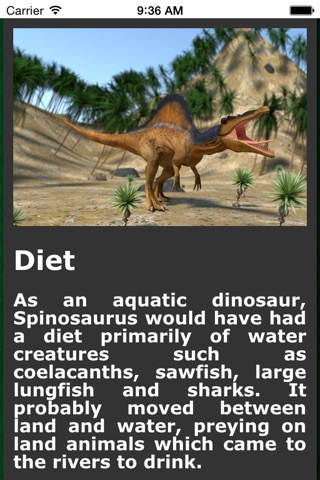 Vibrant animations depict individual species of Dinosaurs - Learn what their names mean, what they ate, their unique features, their evolution and where they lived. Optional narration reads you the text, and colorful maps and size comparison diagrams bring prehistory to life.