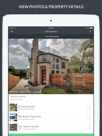 • Create as many Home Boards as you’d like to easily visualize and categorize your home search.