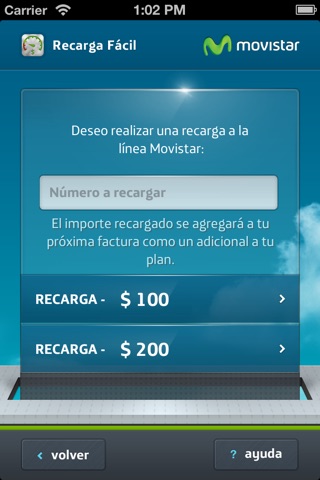 Recarga tu Movistar de forma rápida y sencilla desde tu Smartphone con esta nueva aplicación. Si tu línea es de contrato, lo que recargues será adicionado a tu factura mensual y si es sin contrato, tendrás que abonar lo recargado en los centros de cobranza. La aplicación funciona sin necesidad de registro ni costos adicionales.