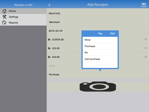 Receipt On Go is an all-inclusive app for tracking and reporting Business Expenses with copies of your receipts, Mileage Log and Time Sheet. Generate and email expense reports in seconds as PDF.