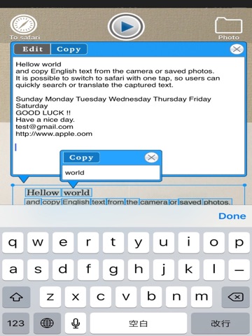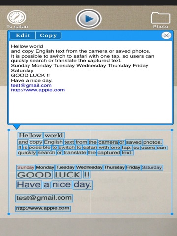 and copy English text from the camera or saved photos. It is possible to switch to safari with one tap, so users can quickly search or translate the captured text.