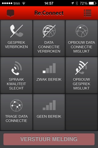 Ervaar je een probleem met ons netwerk, zoals een verbroken verbinding of een zwak data signaal, laat het dan met één druk op de knop aan ons weten via de Re:Connect app.