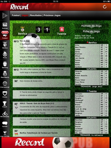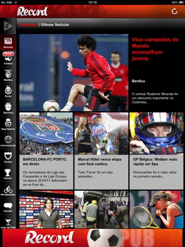 O Jornal Record no seu iPad atualizado ao minuto. Muito mais que notícias. Os jogos em direto com informação detalhada, os resultados e as classificações. O noticiário de Benfica, FC Porto, Sporting e Internacional e o acompanhamento especial de Mourinho e Cristiano Ronaldo no Real Madrid. E como o desporto não é só futebol, tudo o que interessa das diversas modalidades. E ainda os melhores vídeos, os da Record TV. Tudo isto com partilha no Facebook e Twitter.
