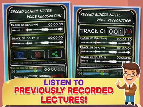 Record School Notes is the best education app for students. It makes doing test study, homework assignments and class lessons easy and fun! This great app turns your phone into a sound recorder so you can record the teachers lecture and not worry about taking notes and missing info or spelling errors.