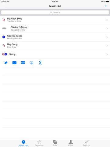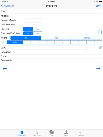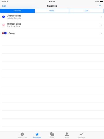 Enjoy keeping track of the songs you listen to in this application without the need for a pencil and paper. Optimize recording music lists by providing the fields needed to quickly track songs. The music list are sortable by ID, Title, and Artst(s) with one press from the tab menu. The music list is also filtered by Favorites, Heard, and Own form the Favorites tab. One consistent form is used from all the menus to make entering and viewing songs easy.