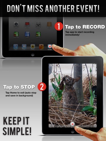 Never miss another moment again! Recording video is now a ONE tap process instead of fizzling with the camera app( tap, wait, change to video mode, wait and tap record). RecordNow will start recording immediately after launch and will save when you exit. Its that easy and RecordNow is a universal app which means you buy it once and you can use it on your iPhone, iPod Touch or iPad!