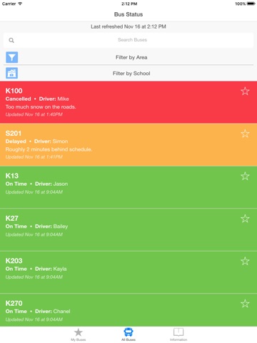 The Bus Status App displays up to date bus information for schools and school divisions. The app sends out push notifications for canceled or delayed buses, keeping your parents and students updated.