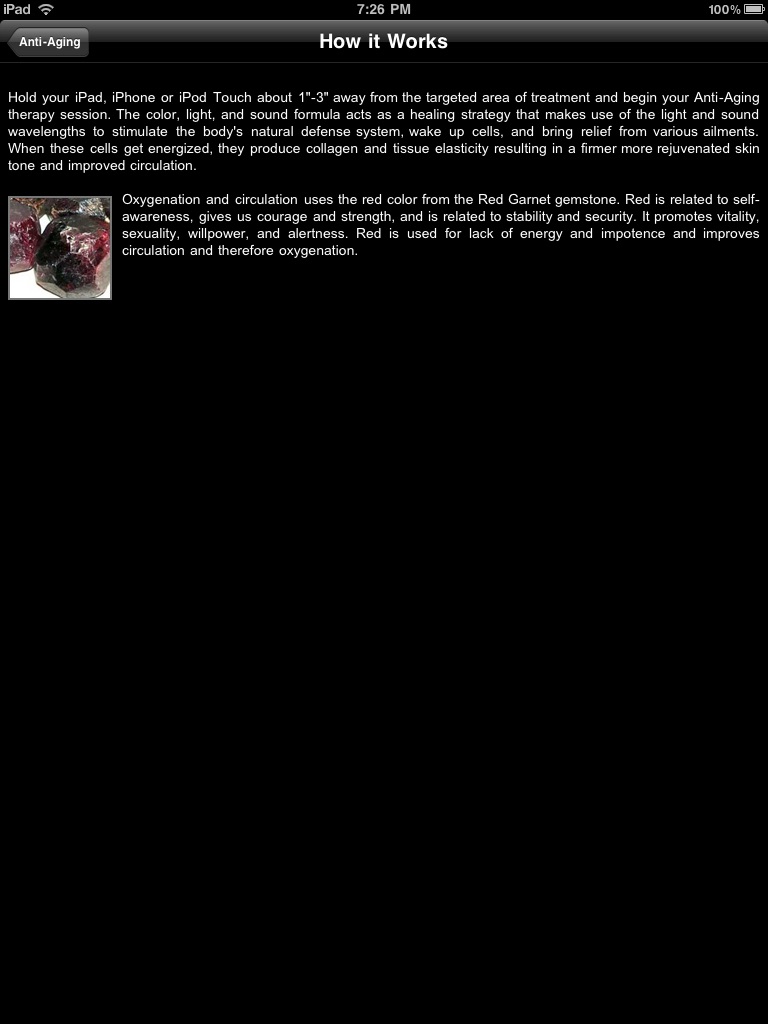 Just hold your iPad, iPhone or iPod Touch about 1"- 3" away from your mind and body and begin your Anti-Aging Red Love therapy session. Noticeable results can sometimes be seen in the very first treatment but generally become more noticeable between the third and fourth treatment and continue to improve for up to six months following a treatment schedule.