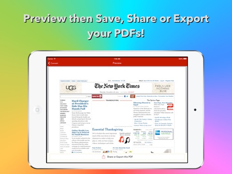 quality conversion - Very useful app. I have the need to save webpages on the go as I work a lot from conference booths, so I decided to give this app a try. I found this app to be very straightforward to work with, and outshines others I tried in both speed and quality of the conversion. great!