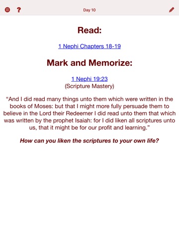 Each day you have approximately 5 pages of the Book of Mormon to read along with verses to mark and/or memorize. There are also things to ponder over, and a place for you to write down your thoughts and feelings in response to questions in each days assignment.