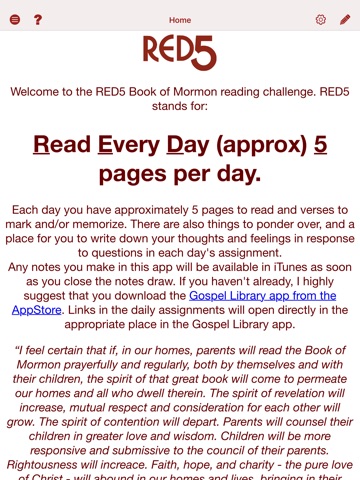 Any notes you make in this app will be available in iTunes as soon as you close the notes drawer. This app is meant to be used in conjunction with the LDS Gospel Library app or with your paper Book of Mormon. Assignments and references in RED5 will open directly in the appropriate place in the Gospel Library app.
