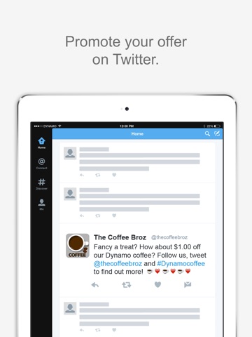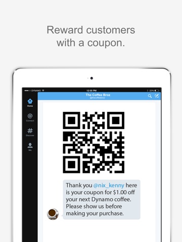 The Redeemable app allows you to validate coupons and reward customers that share experiences with your brand on Twitter. Its a great way to keep the conversation growing about your business. Coupons are shared with your customer securely over private Direct Message.