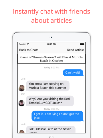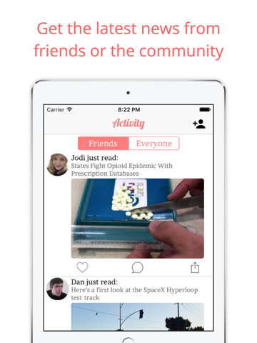 Find and connect with friends using your contacts list. View articles, friends are reading and talking about. Share and invite friends to comment on popular news topics. Open a group discussion to share commentary.