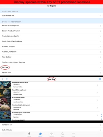 - You can select from 31 pre-defined menu based regions, examples “Caribbean Sea”, or “Australia, tropical” or “West coast United States” and see the species only from that region.