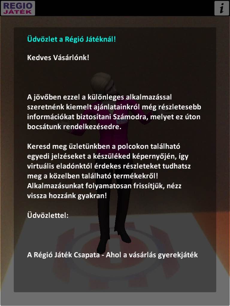 Szerezz a készülékeden keresztül extra termékinformációkat a Régió Játék boltjaiban található termékekről! Az alkalmazás a készülék kameráján keresztül felismeri a boltok polcain található jelzéseket és megjeleníti ezek helyén a virtuális eladót. Az alkalmazást elindítva, a készüléked képernyőjével keresd meg a polcokon a "Kérdezd a virtuális eladót" jelzéseket, melyeken keresztül az eladó segítségedre siet!