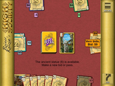 High Society is based on the same very successful MobileEuroCard gaming engine that was used in Reiner Knizias Money, also produced by RPGnet. Simple gestures allow you to examine your own hand and the bids of your opponents. Everything is animated, for a colorful play experience.