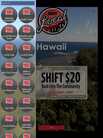 The RelyLocal Hawaii Mobile App provides a gateway for the community to find and benefit from Local businesses in Hawaii. It also provides an additional way for local businesses to provide rewards and special deals to local patrons. It enables businesses and local non for profits to distribute the Rewards Card for even better deals.