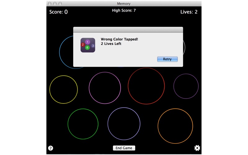 Watch as the circles highlight in a certain pattern. When Go appears at the top of your screen, repeat the pattern by tapping the correct circles in the correct order. For each correct circle tapped you get a point. If an incorrect circle is tapped you lose a life and have a chance to retry the round. You start with three lives.