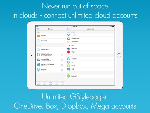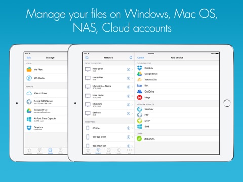 App connects to computers with Mac OS, Windows and Linux, work with files stored on Apple Time Capsule, NAS, WebDav, Cloud services (iCloud, OneDrive, Dropbox, Box, Google Drive)