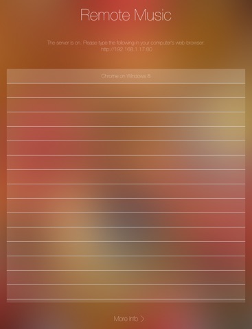 Remote Music is unique because it doesnt require you to install any software on your computer. When you open the app on your iOS Device, it gives you an address that you can type into a computers web browser. From there, you can connect multiple computers and remotely play your music.