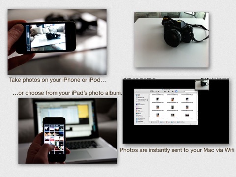 Turn your iPhone and iPad into a wireless photo webcam to transfer pictures directly to your Mac over Wi-Fi. Now works with both the camera and images already in your iPhones photo album! You can also send photos directly to your DropBox account with a single tap.