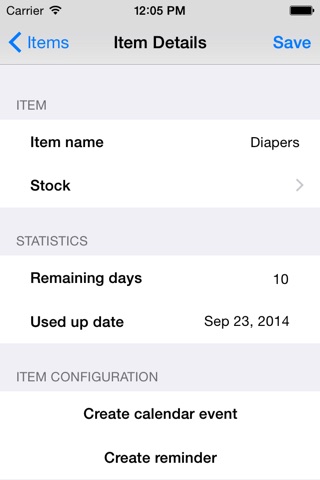 Renewables is integrated with the iOS Calendars and Reminders. You can easily add calendar or reminder entries to be warned early enough before your stock runs out.