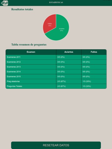 - Modulo de estadísticas para tener un calculo de las preguntas falladas por año o en total, se puede resetear para que los contadores vuelvan a cero